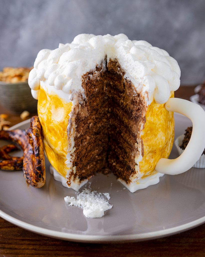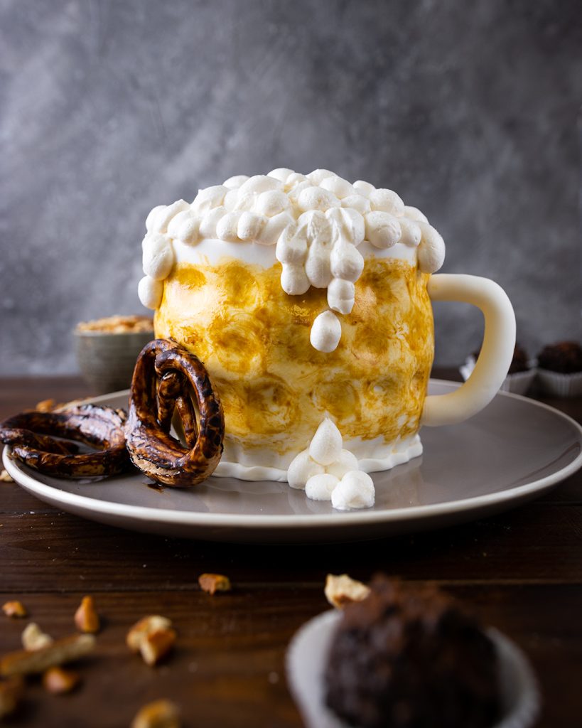 Die Basis der Bierkrug Torte bildet unser saftiger Schokokuchen, verfeinert mit leichter Rum-Note durch eine Tränke. Dieser ist dann abwechselnd geschichtet mit einer leckeren Rum-Creme. Durch das Eindecken mit Fondant und die Tupfen aus Schlag Creme wirkt die Bierkrug Torte am Ende fast wie echt.