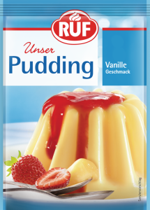 - Für den Pudding ca. 6 EL Milch abnehmen, darin das Puddingpulver und den Zucker anrühren. Die übrige Milch zum Kochen bringen. Die Milch von der Kochstelle nehmen, das angerührte Pulver hinzugeben und unter stetigem Rühren nochmals gut aufkochen.
