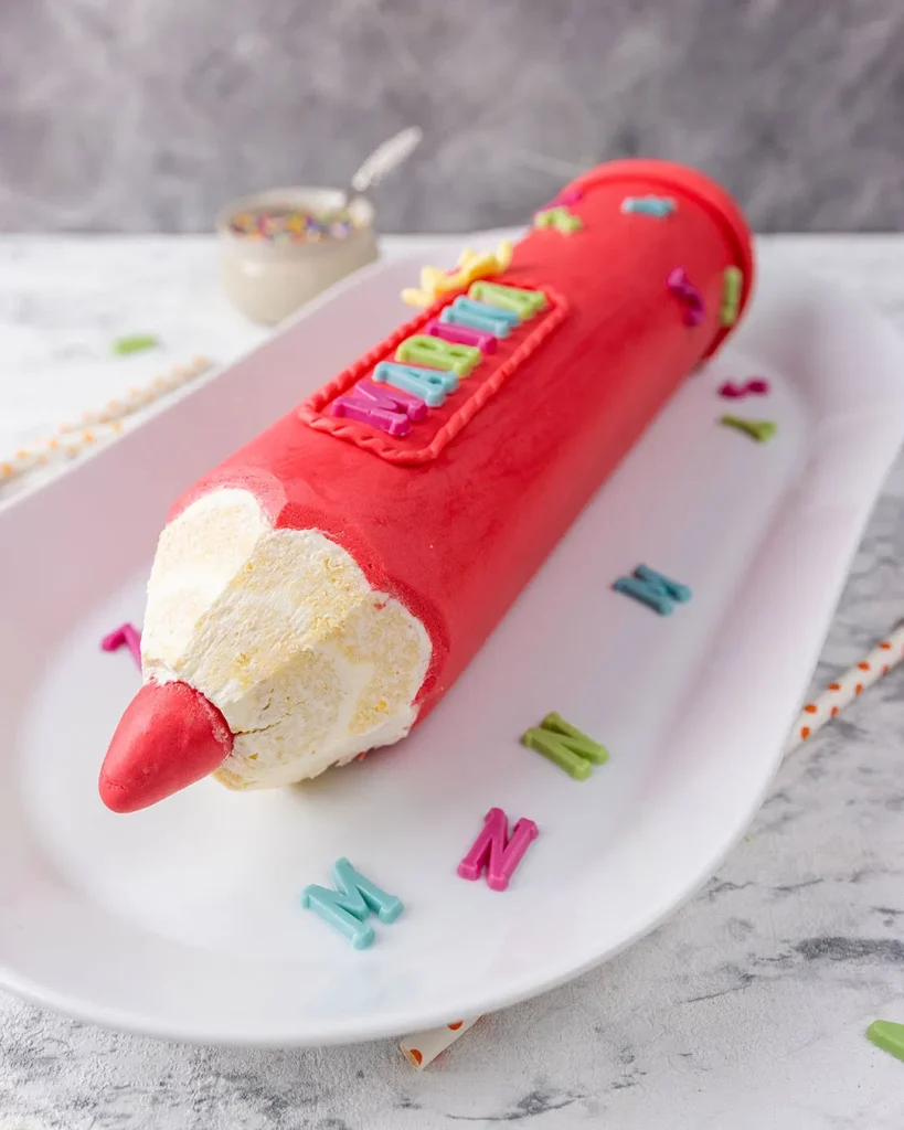 Von außen ist unser Buntstift eingehüllt in unseren roten Fondant. Oben auf verzieren wir unseren Buntstift mit unserem essbaren Bio ABC & Zahlen Dekor.