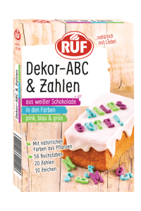 Von außen ist unser Buntstift eingehüllt in unseren roten Fondant. Oben auf verzieren wir unseren Buntstift mit unserem essbaren Bio ABC & Zahlen Dekor.