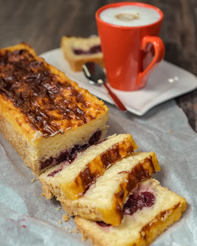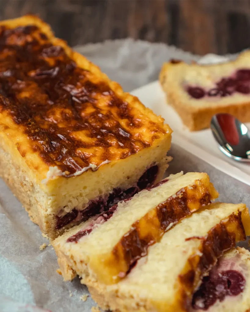 Bekannterweise sind die einfachsten Backrezepte die überraschendsten. So auch dieser unscheinbare Kastenkuchen. Bei jedem Bissen vermutet man einen krümligen Rührteig, doch dieser wird durch einen saftigen, leicht körnigen Milchreis mit Kirschen ersetzt. In Kombination mit dem feinen Mürbeteig sollte man dieses Rezept nicht mehr so schnell aus den Augen verlieren.