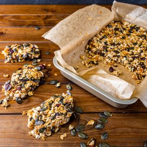 Für unser Müsliriegel-Rezept bleibt der Backofen zwar nicht ganz kalt, aber das richtige Backen entfällt komplett. Unser Grundrezept bietet dir viel Spielraum, denn die einzelnen Zutaten lassen sich ganz einfach austauschen und variieren. Für eine proteinreichere Variante tauschst du einfach die Dinkelflocken gegen Sojaflocken, fügst bspw. Leinsamen hinzu und tauschst die Trockenfrüchte aus.