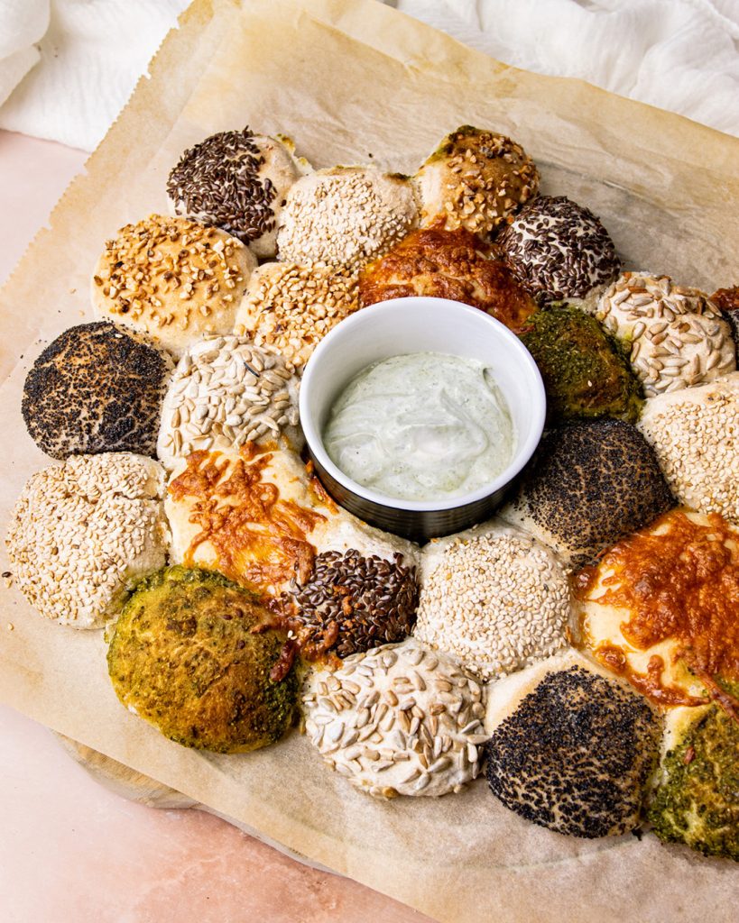 Unser Partybrötchen Rezept ist nicht nur ein toller Snack für jede Party, sondern auch die ideale Beilage zu Grillfesten oder Buffets. Die kleinen Brötchen lassen sich leicht teilen und sind somit perfekt zum Teilen mit Freunden und Familie. Serviert mit unserem Schmand-Dip, Kräuterbutter oder auch einfach Olivenöl werdet ihr eure Gäste garantiert begeistern.