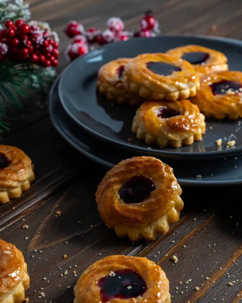 - In der Zwischenzeit ein Glas Mehrfrucht- oder Johannisbeerenkonfitüre aufkochen und diese anschließend vorsichtig in die Mitte der Kekse geben.