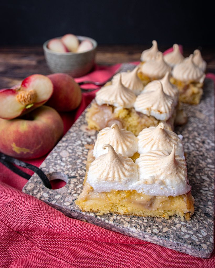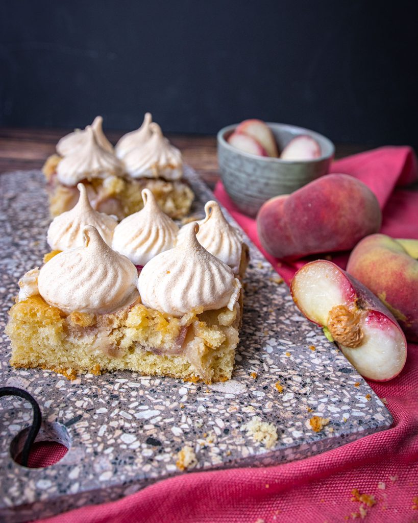 Sommerlicher Pfirsichkuchen mit frischen Pfirsichen und Baiser-Tröpfchen