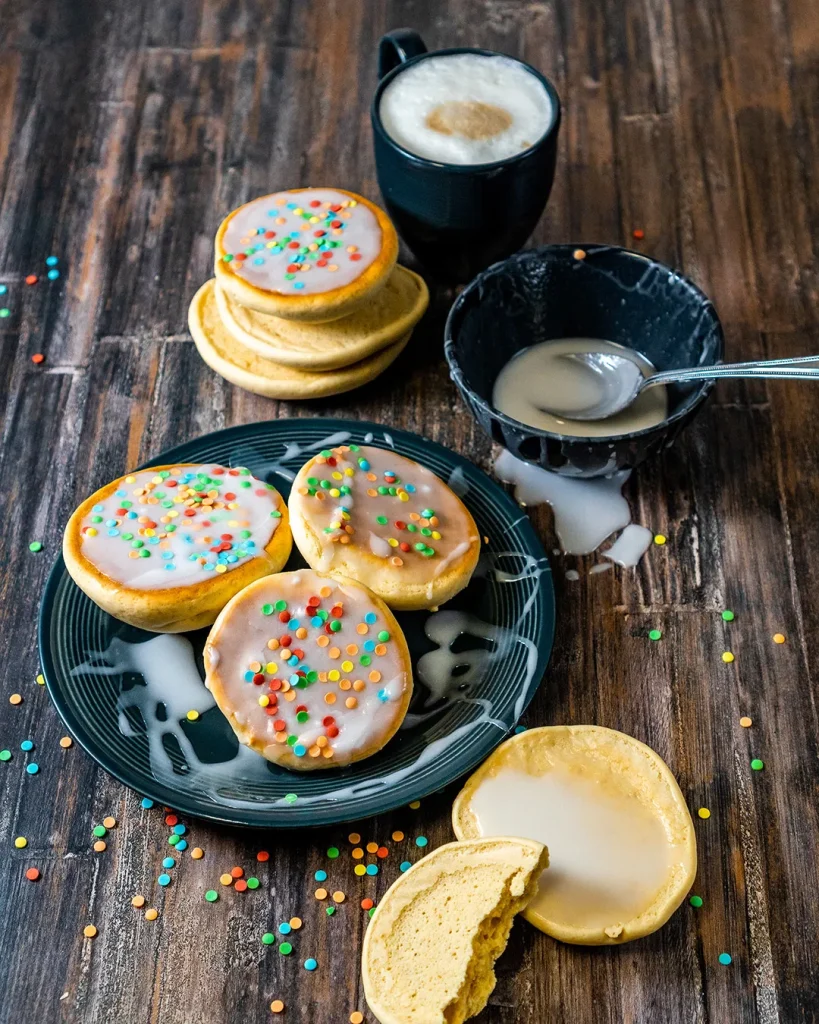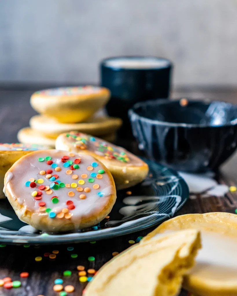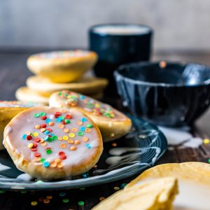 - Die Amerikaner damit bestreichen und das bunte Konfetti auf der noch flüssigen Glasur verteilen.
