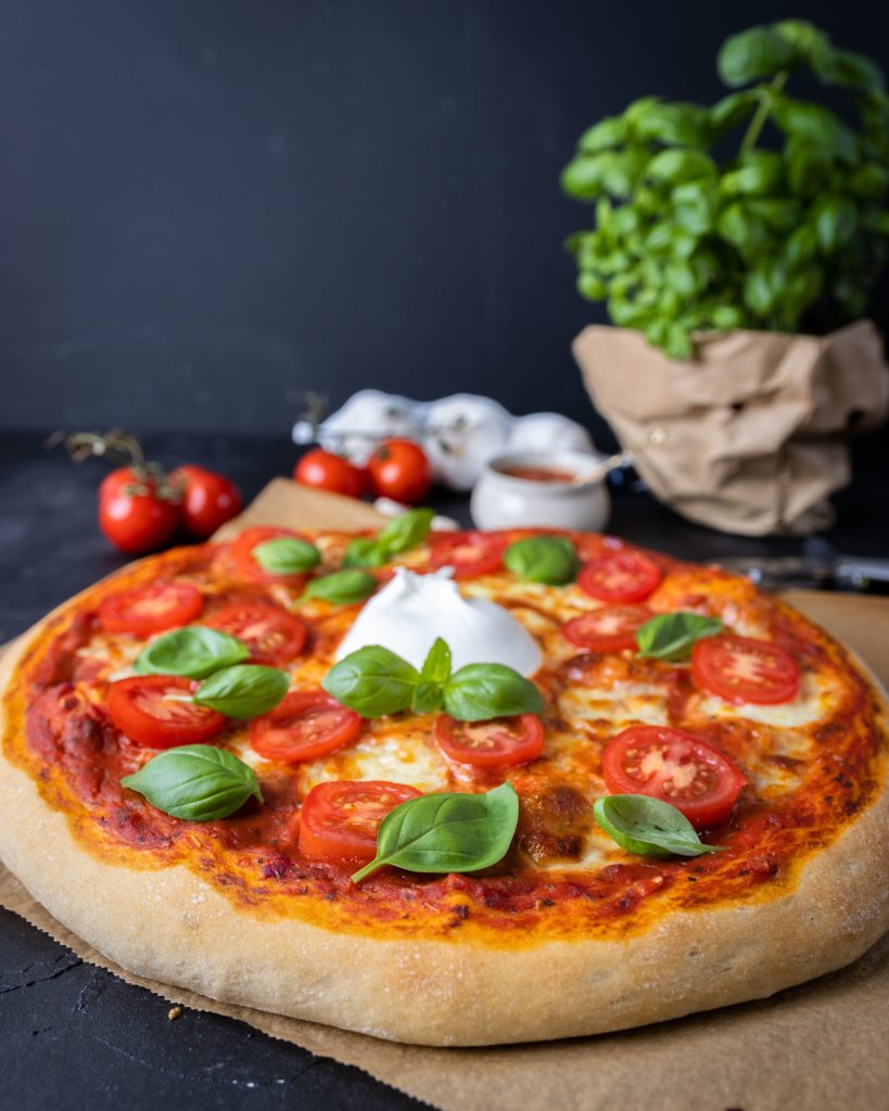 - Anschließend die Pizza mit Burrata und Basilikumblättern dekorieren und warm genießen.