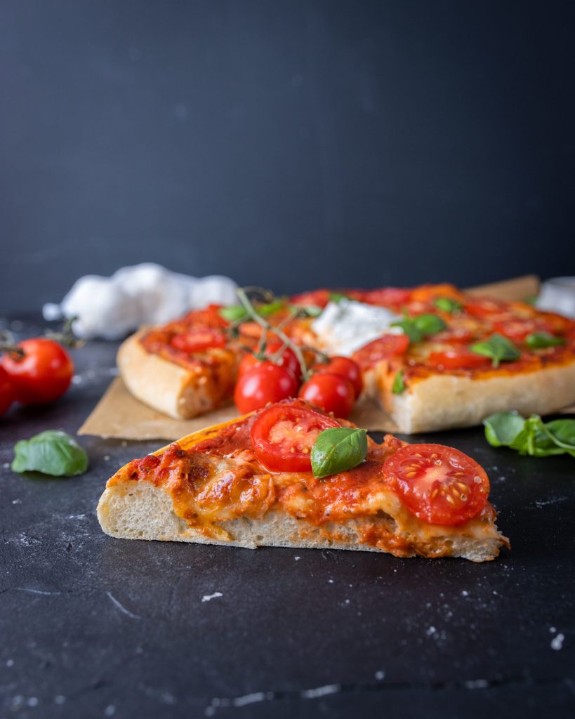 Unsere Pizza mit Sauerteig kommt mit einer leckeren Tomatensoße, Tomaten, Burrata und Rucola daher und könnte köstlicher nicht sein. Der aromatische Geschmack des Sauerteiges ergänzt sich wunderbar mit der frischen Tomatensoße und den Tomaten.