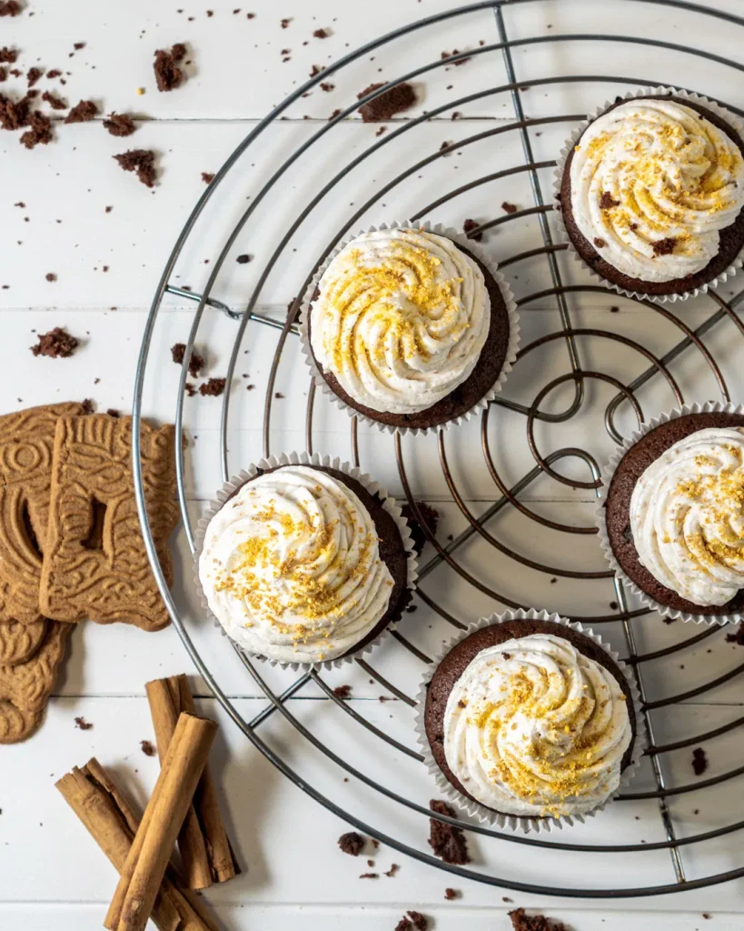 - Die Spekulatius in einen Gefrierbeutel geben und mit einem Nudelholz zu feinen Bröseln verarbeiten. Die Brösel unter die Creme heben, in einen Spritzbeutel mit Sterntülle geben und auf die Cupcakes spritzen.