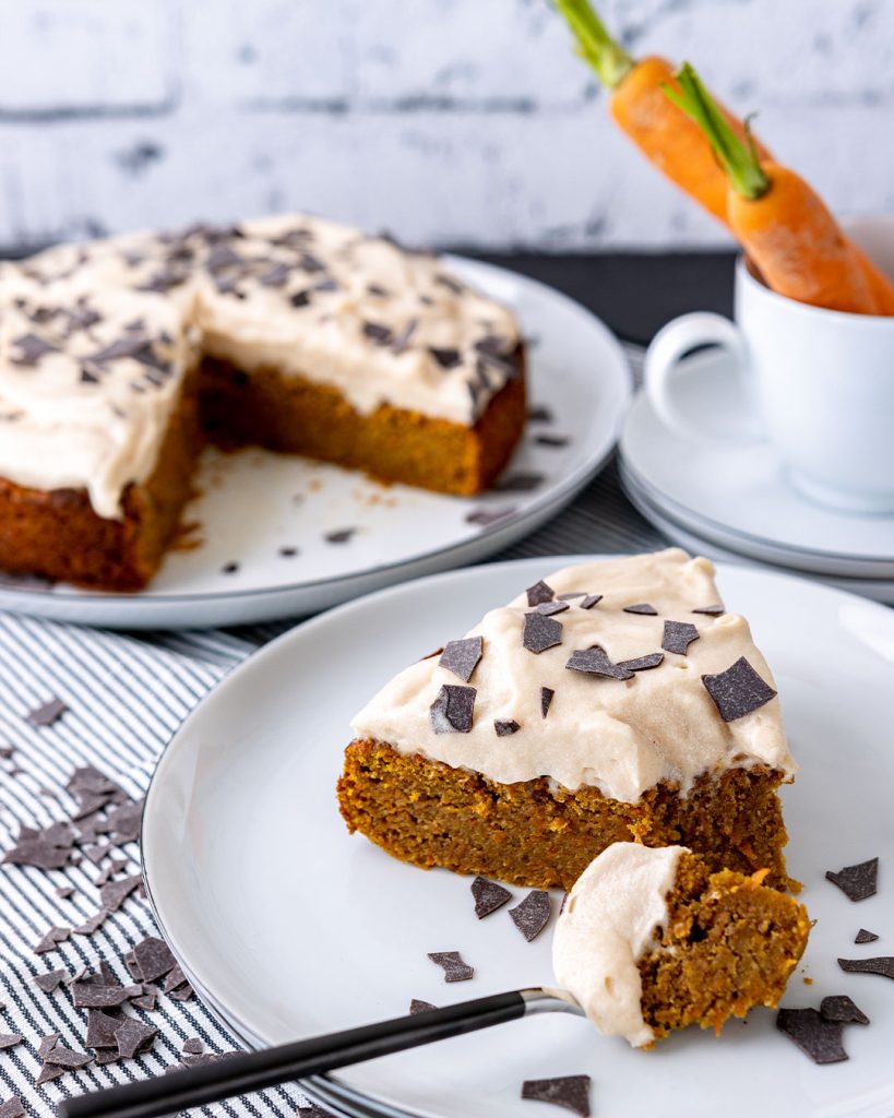 Daher ist bei unserem saftigen Karottenkuchen ohne Ei auch das Karottenraspeln das aufwendigste. Die restlichen Zutaten müssen lediglich in einer Schüssel verrührt werden. Natürlich darf bei einem Karottenkuchen ein angemessenes Frosting bzw. Topping nicht fehlen, weshalb wir hier einfach vegane Sahne (Schlagcreme) mit Mandelmus vermengen. Die Kombination ist unvergleichlich lecker und macht den Karottenkuchen zu einem echten Highlight – so einen gesunden und dennoch leckeren Karottenkuchen hast du sicherlich noch nie gegessen!