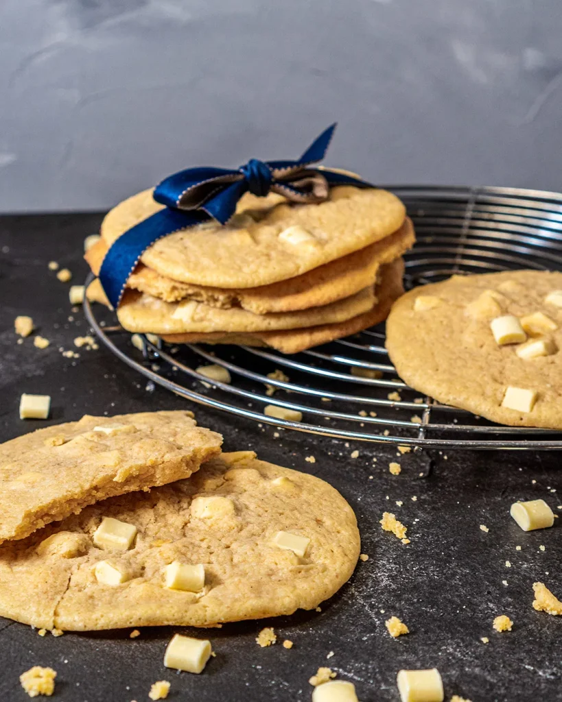 - Die Cookies 11-15 Minuten backen. Sie sollten noch recht hell und in der Mitte leicht flüssig sein. Nach dem Backen die Kekse auf dem Blech richtig auskühlen lassen.