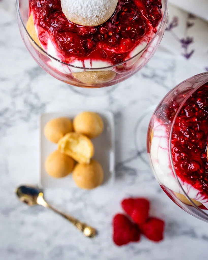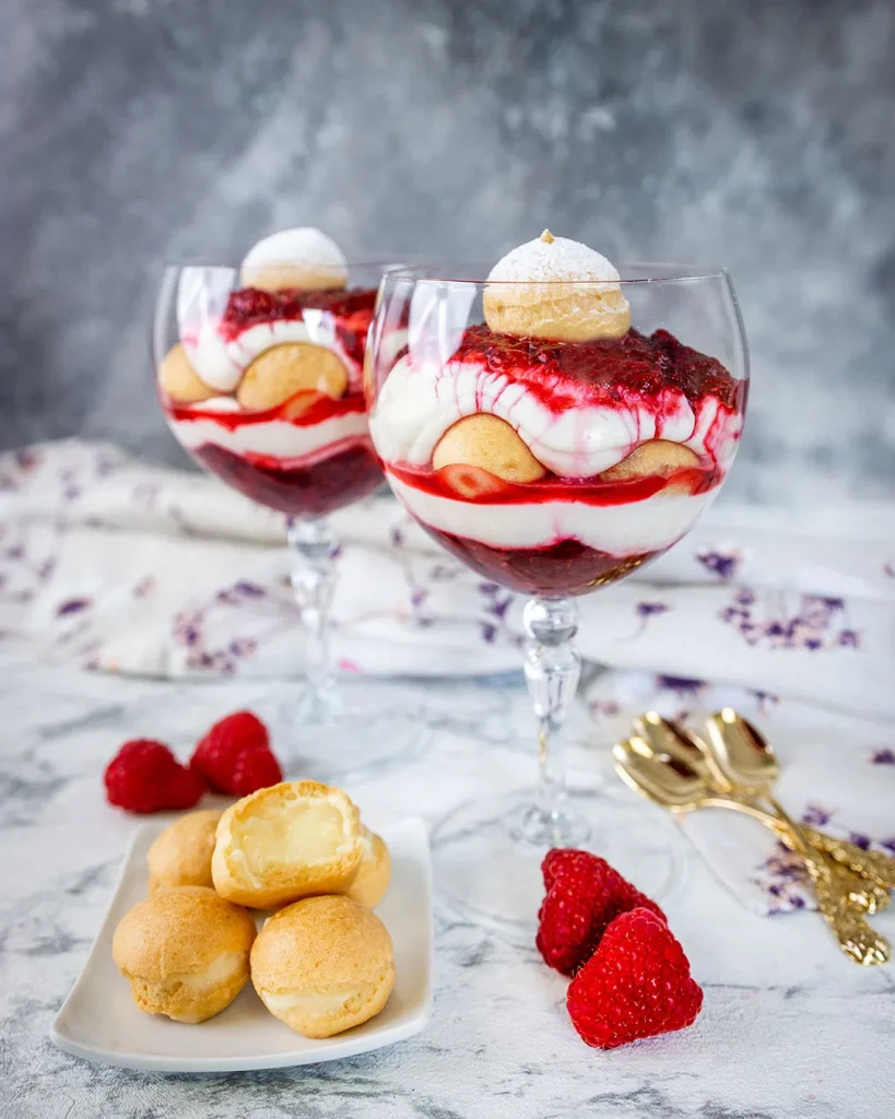 Dieses einfache Dessert kombiniert vieles, was wir an einem Schicht-Dessert so lieben: Eine herrliche Käse-Sahne-Creme, ein Gebäck in Form von einem köstlichen Brandteig und Himbeeren, vereint als Fruchtpüree. Alles zusammen macht unser Windbeutel-Dessert zu einem genialen Abschluss eines jeden Geburtstagsessen, zu Weihnachten oder bei einem leckeren Abendessen.
