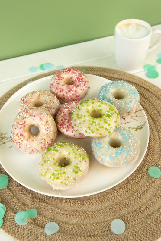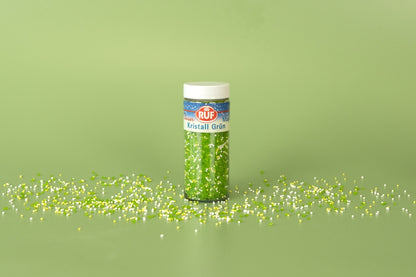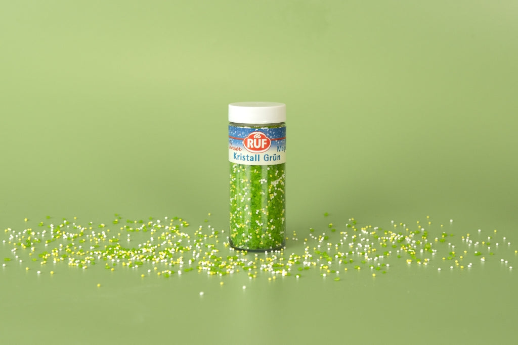 Manchmal muss es beim Backen richtig schön bunt werden. Mit den verschiedensten Streudekoren lassen sich auf deinen Cupcakes, Torten, Keksen und Eiskreationen viele schöne Akzente setzen.Besonders unser Dekor Kristall Grün macht deine Kreationen zu etwas Besonderem. Die effektvollen grünen Zuckerkristalle und die weißen Nonpareilles sorgen für eine ausgefallene Optik auf dem Frosting deiner Cupcakes. Aber auch als Randabschluss auf deiner Torte wirkt dies Dekor ganz wundervoll: Streiche dafür beispielsweise etwas unseres RUF Lebensmittelklebers auf den Rand der Fondanttorte und drücke die Kristalle und Kügelchen anschließend vorsichtig und leicht fest.Dank der praktischen, schmalen Dosen lassen sich die Dekore perfekt dosieren und problemlos und platzsparend lagern.