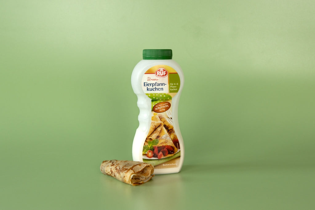 Die verschlossene Flasche vor Zugabe der Milch kräftig schütteln. Dann die Milch bis zur Markierung in die Flasche füllen (ca. 400 ml). Die Flasche danach wieder gut verschließen. Ca. 1 Minute kräftig schütteln, bis sich das Pulver vollständig vom Boden gelöst hat. Den Teig anschließend 2-3 Minuten ruhen lassen. Etwas Margarine oder Öl in einer beschichteten Pfanne erhitzen. Flasche kurz schütteln und so viel Teig in die Pfanne gießen, dass der Boden bedeckt ist. Bei mittlerer Hitze von beiden Seiten goldbraun backen.