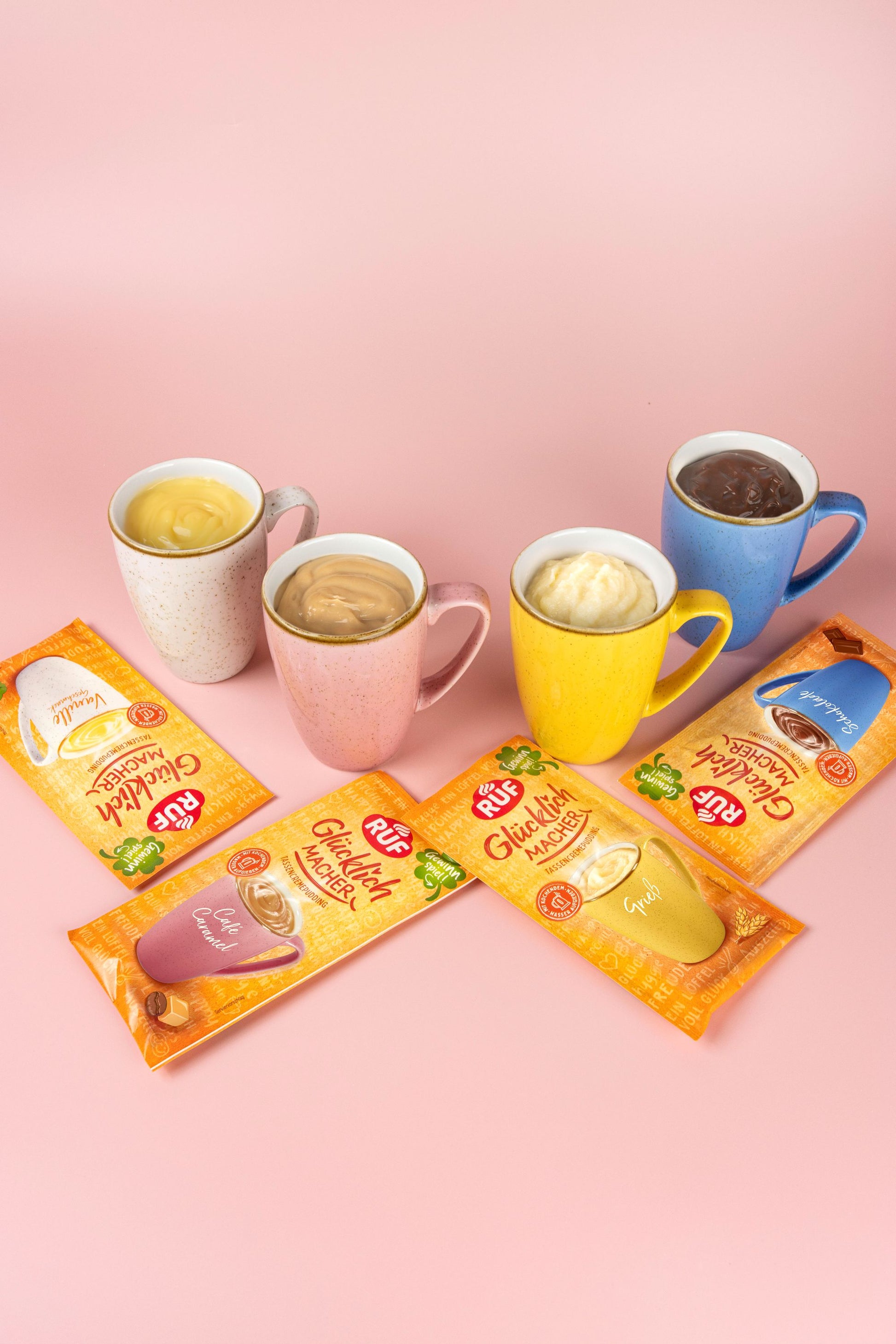 Entdecke den Geschmack des Glücks: RUF Glücklichmacher Box mit 4 Tassen und 8 Puddingen