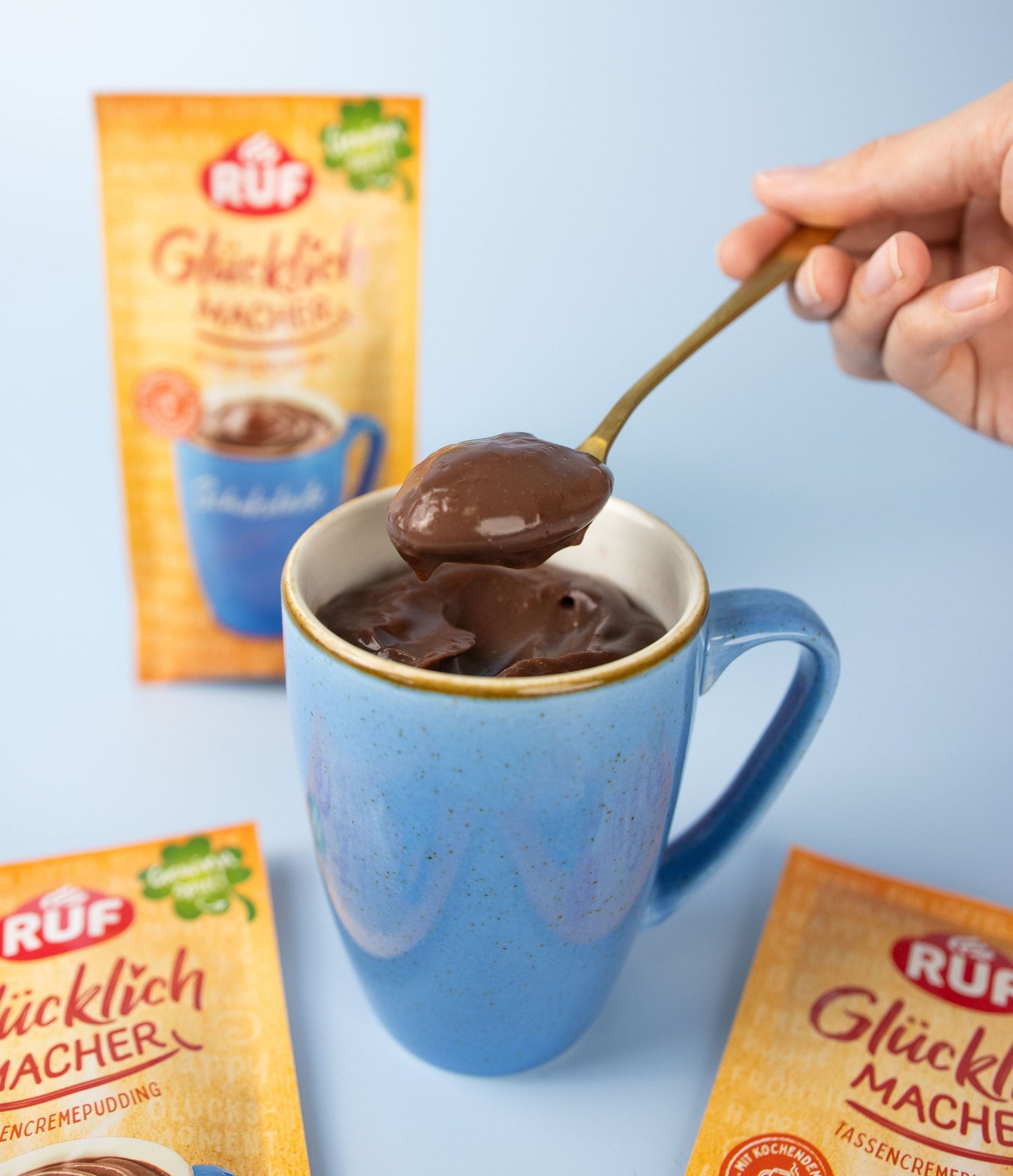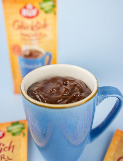 Der RUF Glücklichmacher Tassenpudding Schokolade begeistert mit seinem vollen Schokoladengeschmack. Die einfache Zubereitung macht ihn zur perfekten Nascherei für jeden Anlass: Gib den Inhalt des 59g-Beutels in eine Tasse, füge 150 ml kochendes Wasser hinzu, rühre um und genieße einen herrlich schokoladigen Pudding in wenigen Minuten.