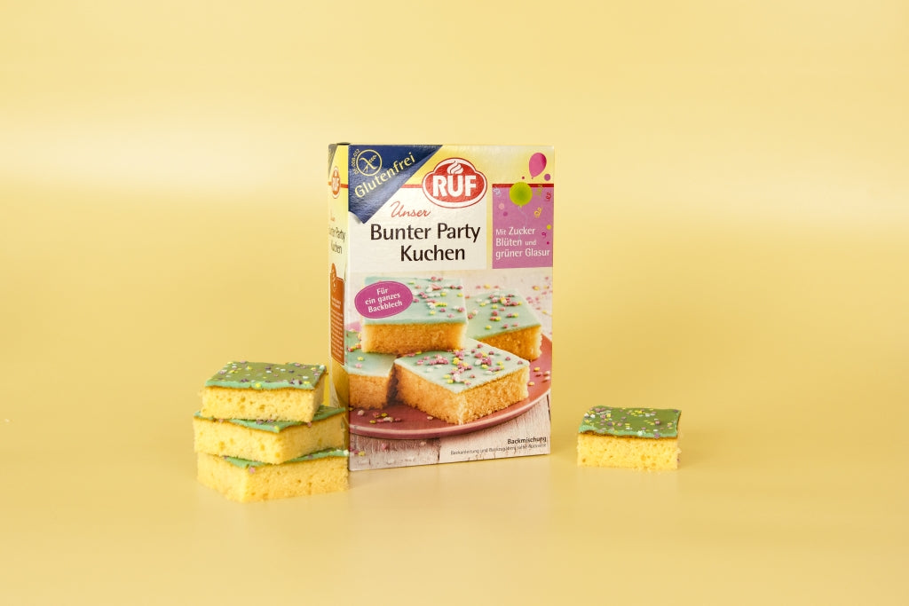 Backmischung: Reismehl, Zucker, Kartoffelstärke, Backpulver (Säuerungsmittel Diphosphate, Backtriebmittel Natriumcarbonate, Maisstärke), Verdickungsmittel Xanthan, Aroma.