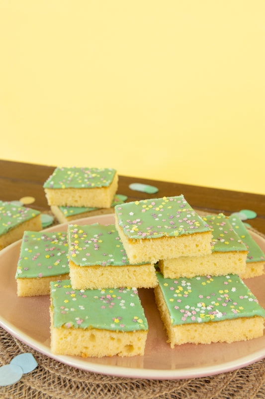 Zuckerglasurmischung grün (24,5 %): Zucker, modifizierte Stärke, Hühnereiweißpulver, Säuerungsmittel Citronensäure, Farbstoffe (Carotin, Patentblau V), natürliches Aroma.