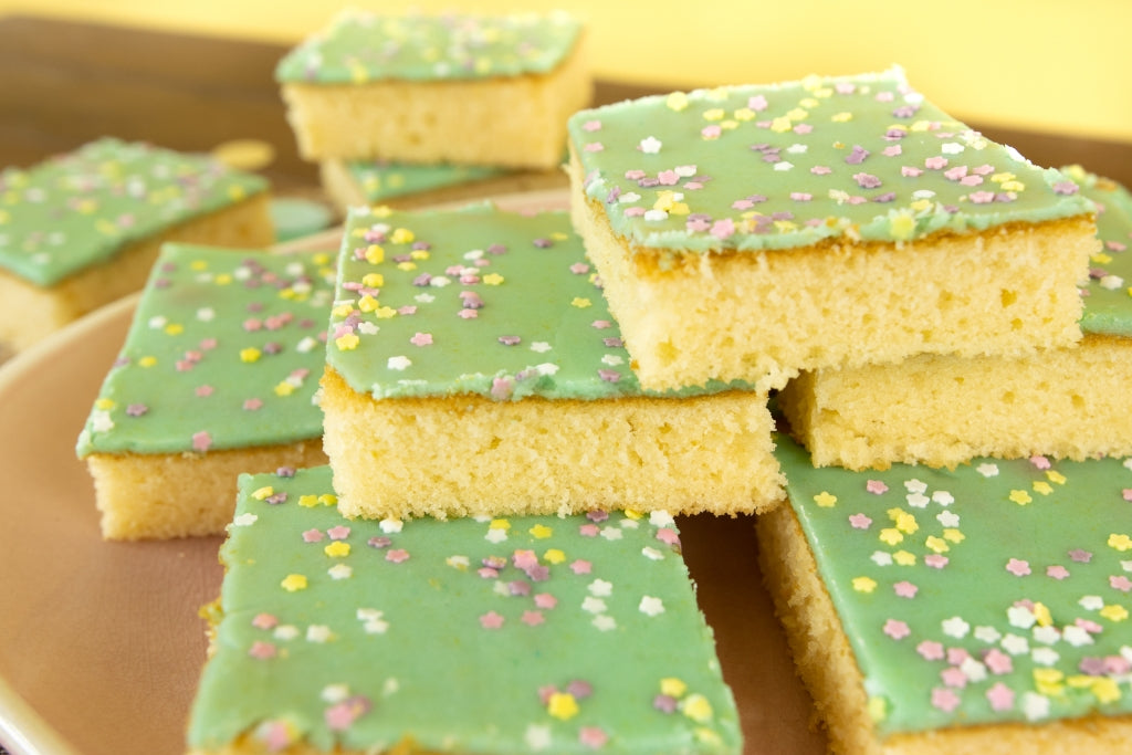 Die Glasurmischung mit Wasser glatt rühren und auf dem Kuchen verteilen. Die Zuckermargeriten auf die noch feuchte Glasur streuen.