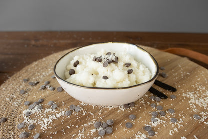 Kaum ein Gericht weckt so viele Kindheitserinnerungen wie Milchreis. Daher gibt es doch nichts Schöneres, als wenn man im Herbst oder Winter aus der nassen Kälte ins Haus kommt und man sich mit einem wohligen, warmen Milchreis unter einer Decke verkriecht.Für jeden Milchreis-Fan haben wir eine tolle, vegane Alternative zum klassischen Milchreis: Unseren superschnellen, veganen Minuten Kokos-Reis mit Kokosraspeln! Die Zubereitung ist ganz unkompliziert, denn der Inhalt des Beutels muss nur mit 150 ml kochendem Wasser aufgegossen werden, 7 Minuten ziehen lassen, umrühren, fertig! Einfacher kann eine Portion Milchreis nicht zubereitet werden, und das ganz ohne Anbrennen.Bei der Herstellung verzichten wir auf jeglichen Schnickschnack und Süßen den Milchreis ganz fein mit der natürlichen Süße aus der Agave. Ob mit Zimt oder mit frischen Früchten dekoriert, schmeckt der wohlig, warme Reisbrei unglaublich lecker!