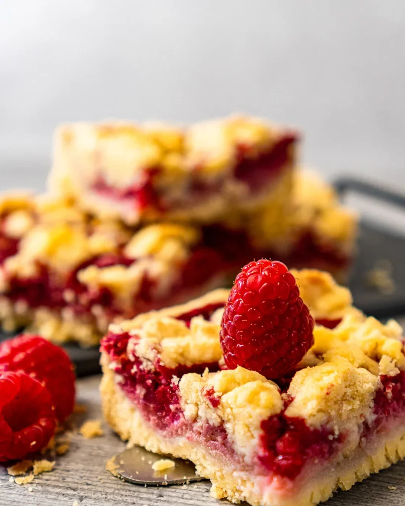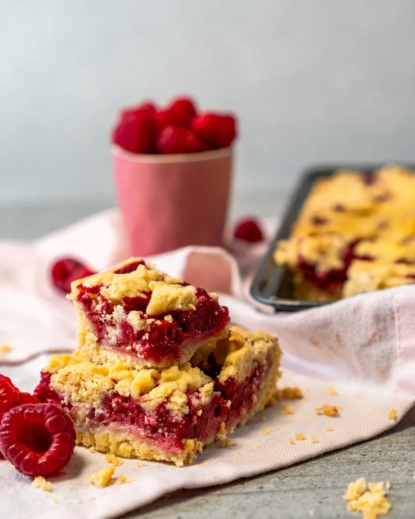 Falls du gerade keine Himbeeren zur Hand hast, kannst du sie ganz einfach durch andere Früchte ersetzen. Dieser Streuselkuchen schmeckt auch mit Kirschen, Pfirsichen, Zwetschgen, Pflaumen oder Äpfeln. Darüber hinaus kommt unser Streuselkuchen ganz ohne Hefe aus und ist daher super fix zubereitet!